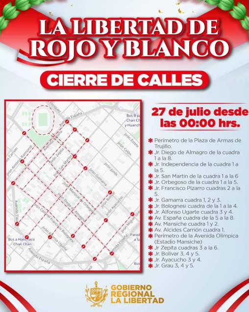 A partir del 27 de julio, el acceso al centro histórico de Trujillo estará restringido debido a las actividades programadas por las fiestas patrias. Así lo anunció el Gobierno Regional de La Libertad.